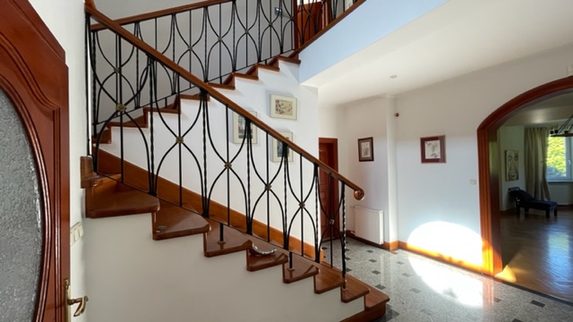parter – salon z kominkiem, jadalnia, kuchnia, gabinet, przedsionek, duży hall, garderoba, wc